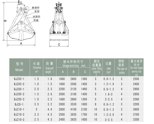گرفتن نوع نیمه برشی نوع جذب طولانی قطب چنگ زدن و گرفتن نوع برشی و ترکیب دو مزیت مانند ساعد، قدم زنی با تبختر متحرک، قطب ثابت و فک، و غیره است. لولا مرکزی ساعد در انتهای بازوی جلو لولا مرکزی صفحه فک لولایی است و انتهای دیگر چرخ کشویی مجهز است. چرخ کشویی در جریان این عملیات که فک، بتواند مواد بسته است و نیروی grasping قوی است بلند است. برای باز کردن آسان است و مناسب برای حمل مواد فله مانند شن و زرد و زغال سنگ و شن و ماسه پودر و سرباره فولاد های تک طناب دو طناب جرثقیل است.